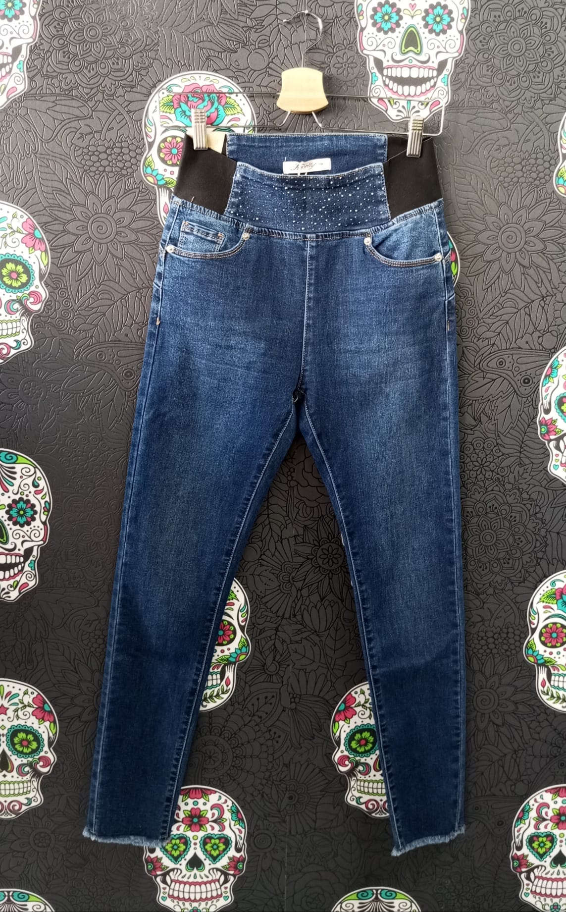Leggins vaquero elásticos. Y tienen strass en la cintura.