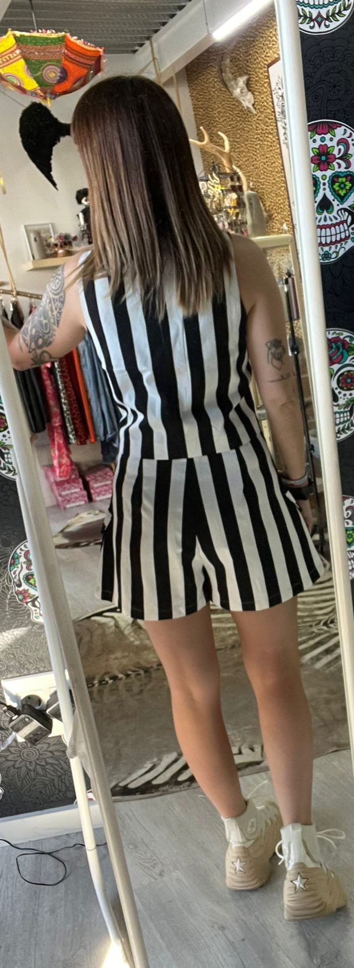 Pantalón de tela con adornos de botones dorados y cremallera en la parte de atrás