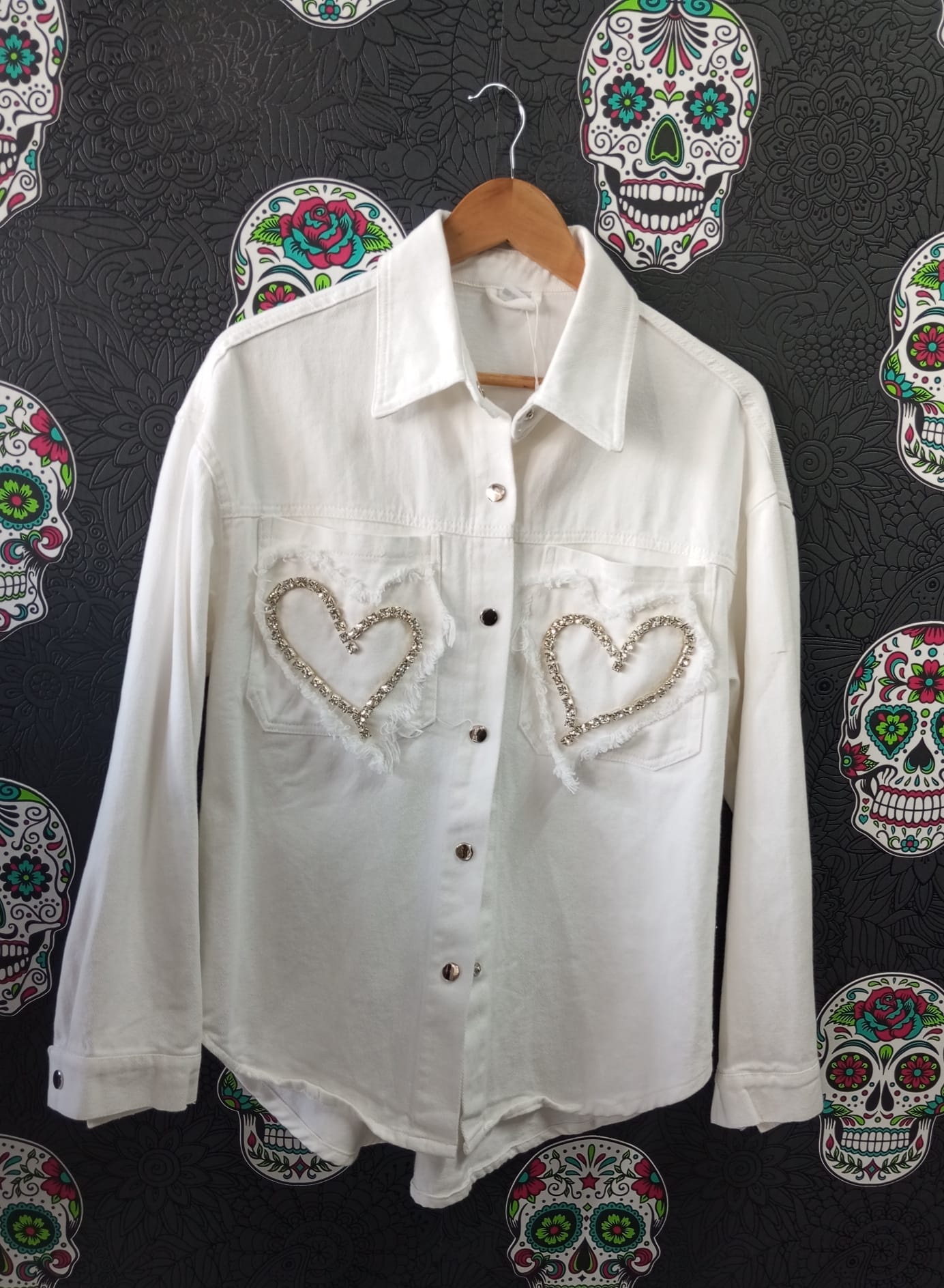 Sobre camisa vaquera con apliques de corazón de brillantes en los bolsillos.